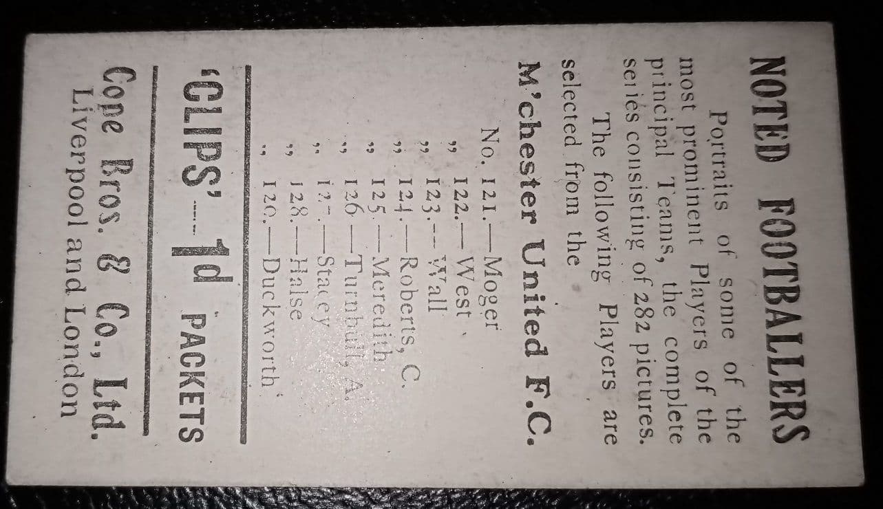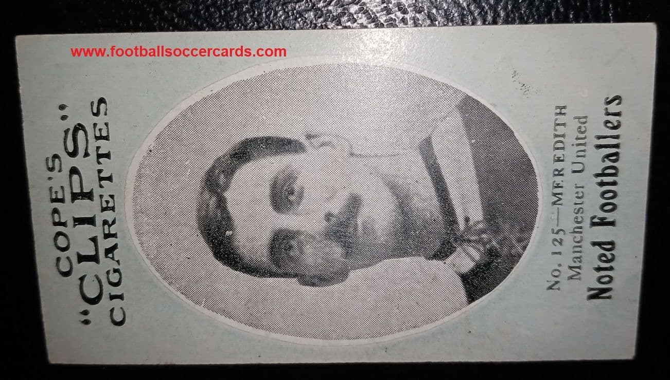 An original, very rare 1909 cigarette card of Billy Meredith #125 by Cope Brothers, a "Clips" series, "Noted Footballers" card with the 282 back (not 500). I sold one in slightly sharper form, for £3k, and a similar card on EB sold for £4,375+ 2 years ago so this is a great chance for someone to pick up a VG card for only £2,400! See all pictures below, to see more... NOTE: the hatching in the image is not on the card it's on the scan. The card has NO creases, just 4 light corner indents from an old slot in album. There are one or two marks notably a small indent to the lower right corner, not a crease but a pencil mark. Generally VG. Sold as seen