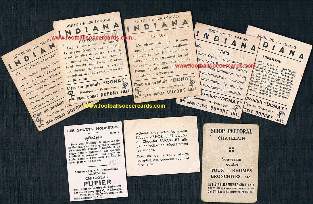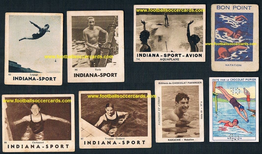 1930s Jean Donat Dupont Indiana Sport gum cards on swimming and water sports, including champiosn and all time great swimmers Yvonne Godard, Taris, Cartonet and Lepage PLUS 3 other cards including a stunning art deco design. All from France, mostly 1930s.